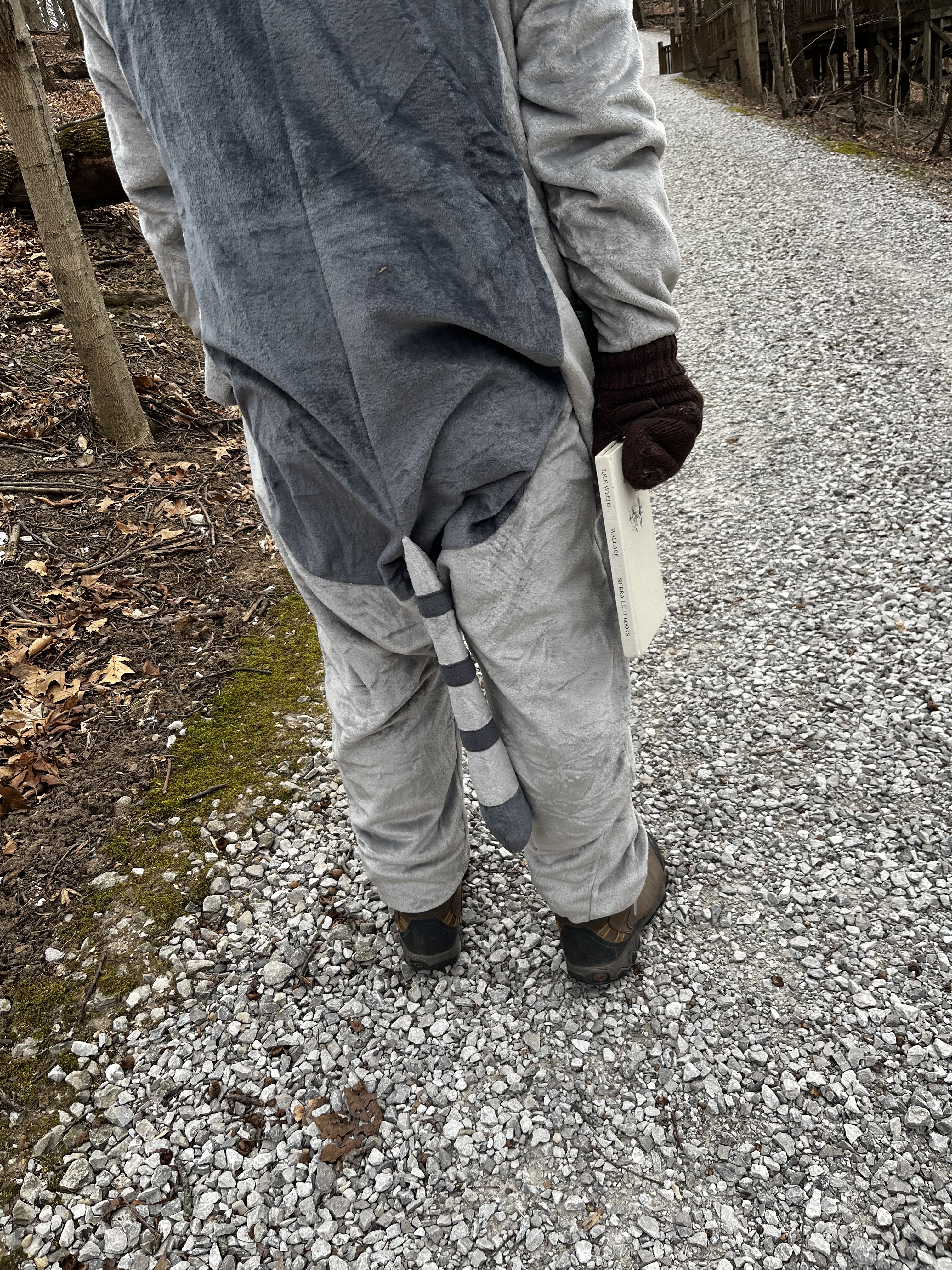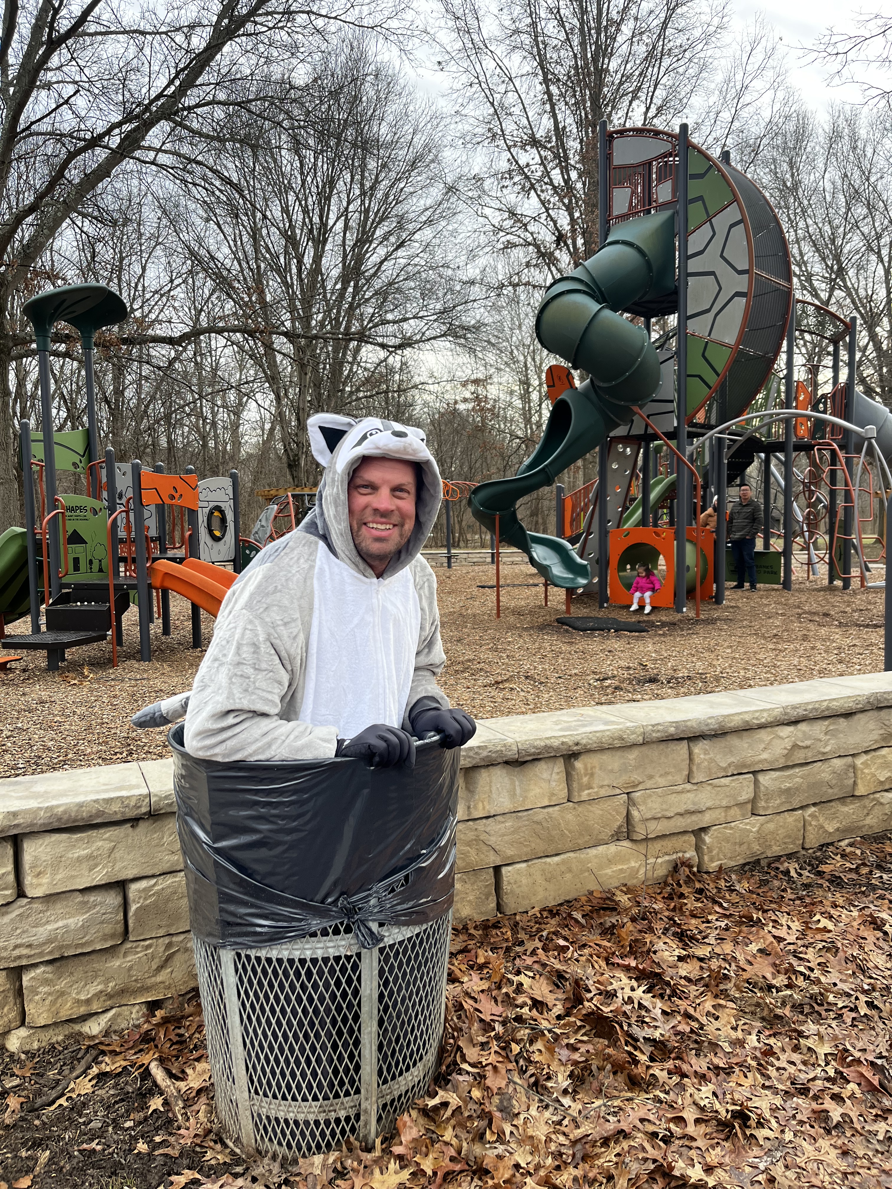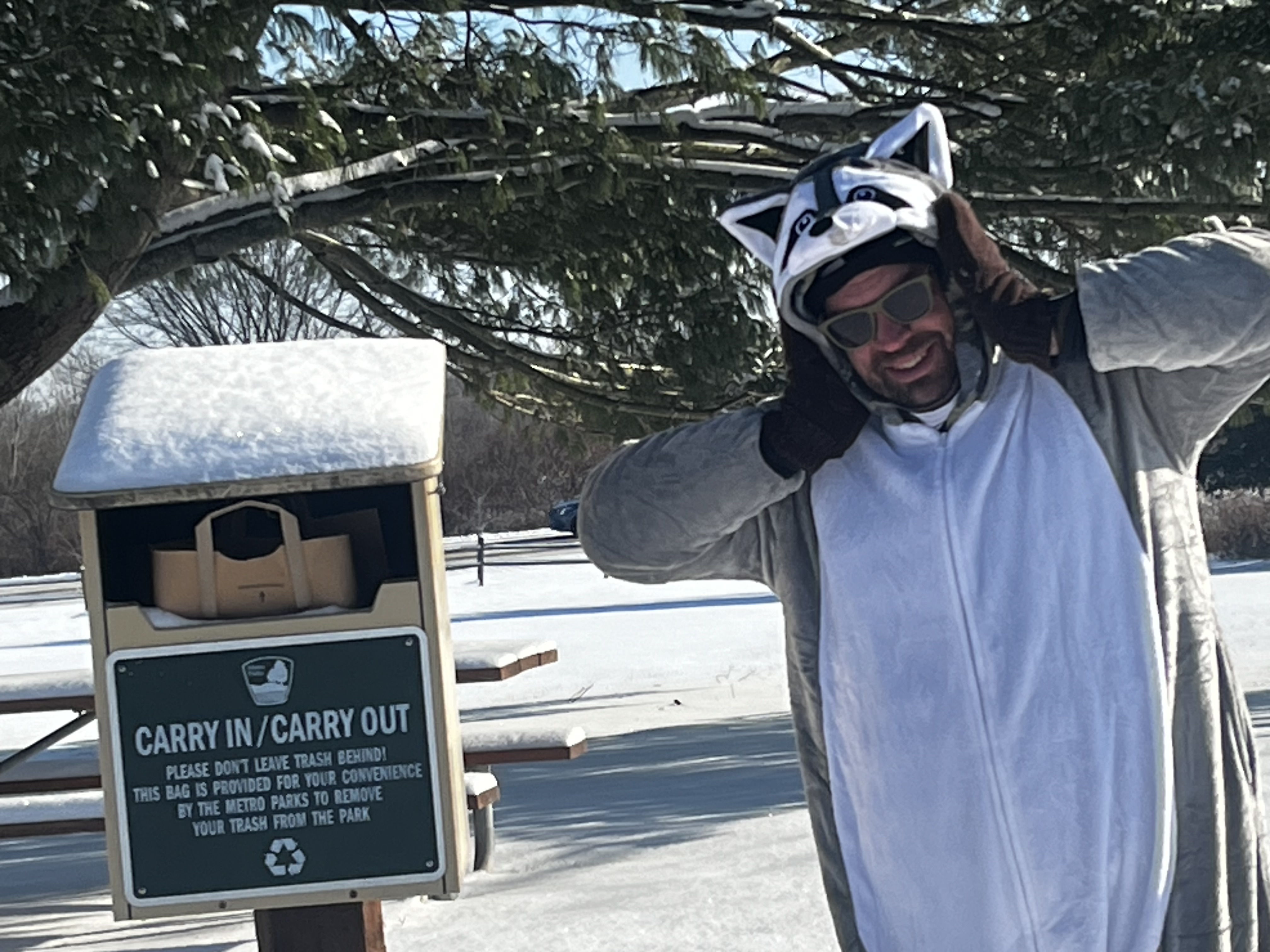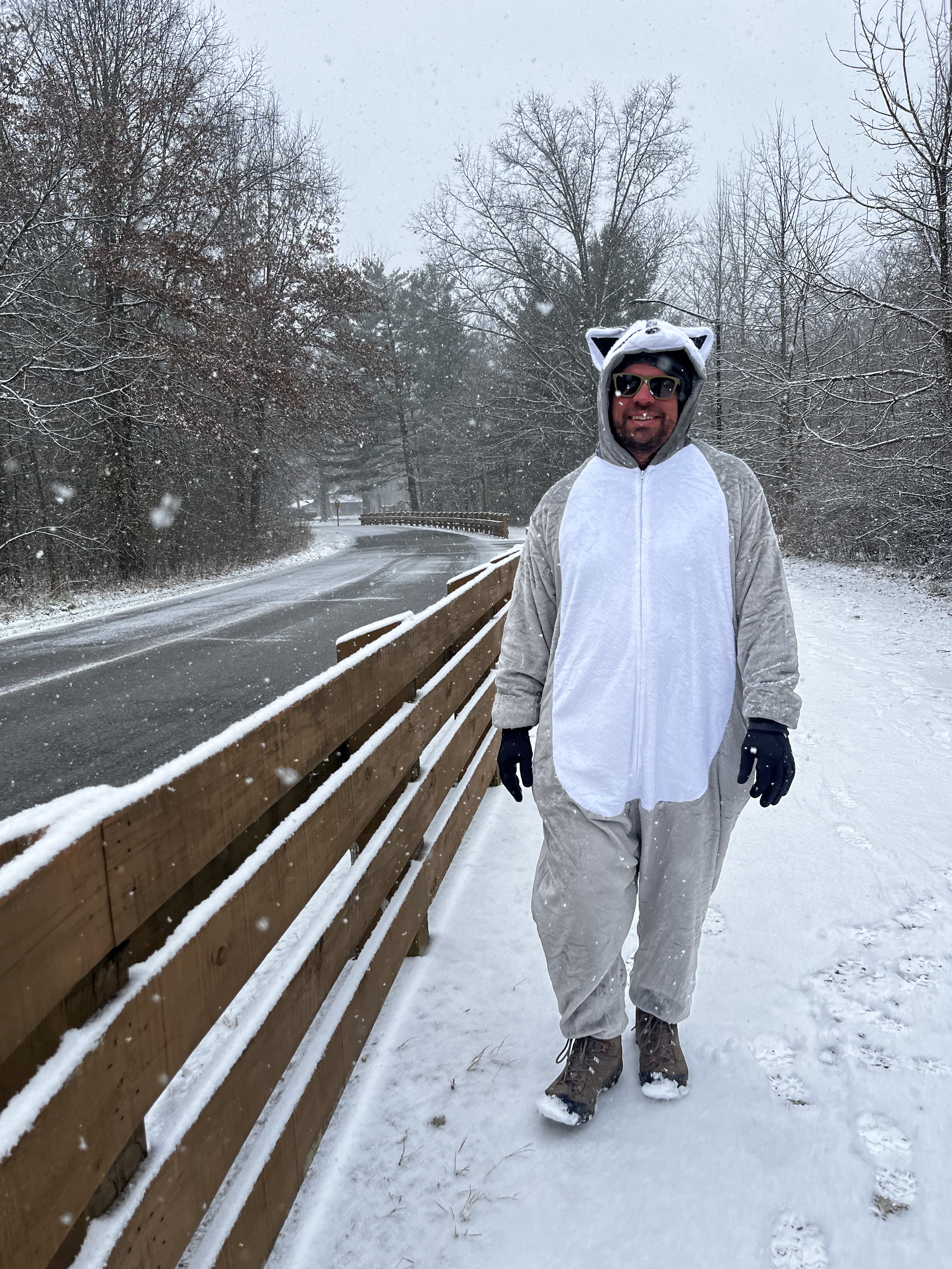 Maybe it’s because we’re safely within the Columbus and Franklin County Metro Parks – I don’t let my husband take me out to lunch or grocery shopping in his adult-sized onesie – but we’ve never encountered hostility or rudeness when he’s in costume. There was one incident that involved a playful tug of the raccoon’s tail, but it was all in good fun.