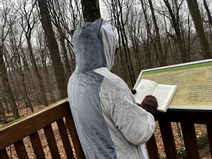There are so many amazing parks on the ‘punch card’ that hikers carry with them on their adventures. We opted for earning digital badges this year, which meant we had more time at the parks and less time hunting for my card before we could get out of the house or the car or my bag. Inspired to tell a story, I dream up things for my husband to do, often in line with the character for that season. It was especially fun imagine how a raccoon (or a fox in years past) would be received by the livestock on a working historical farm. (Note: No animals were harmed in the documenting of our adventures.)