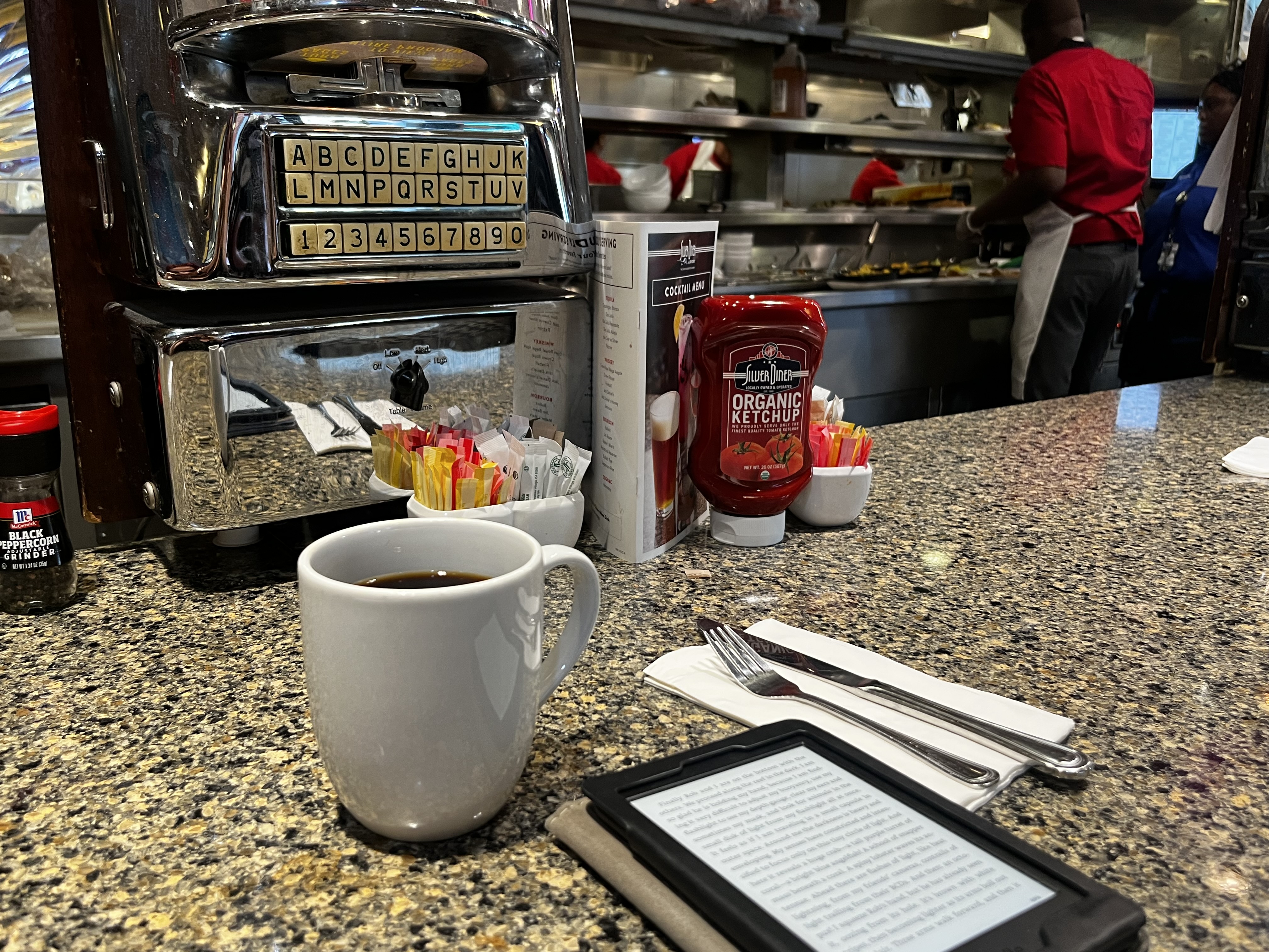 In the evening, to my right, glasses of white wine and a charcutier board created a space for sorority sisters to catch up, after years apart, and make elaborate plans for a new adventure. On my left, I watched two students study diligently for an hour or so, then reward themselves with a few chapters of their romance novels, relaxing with their feet up on the bench beside them.