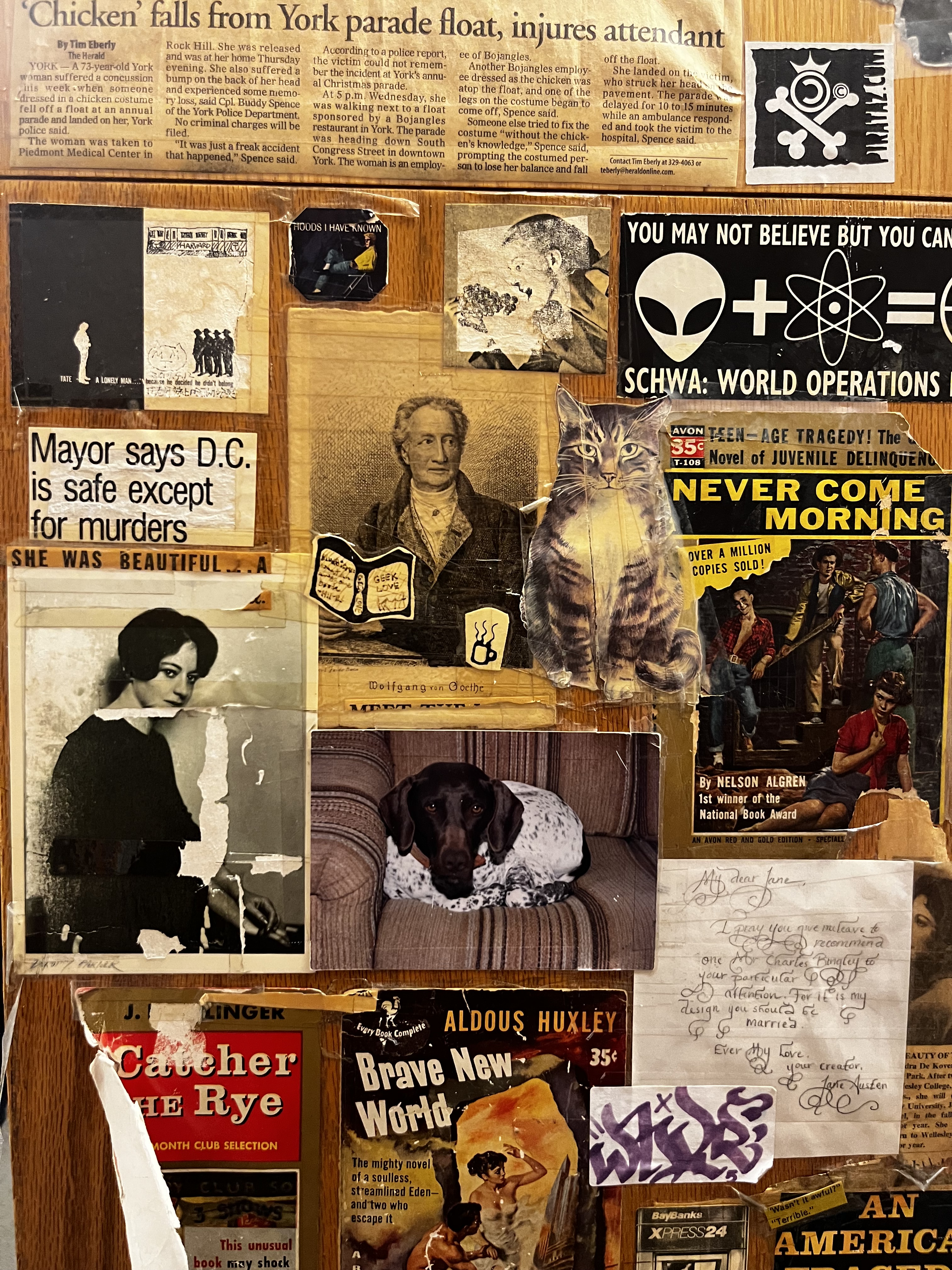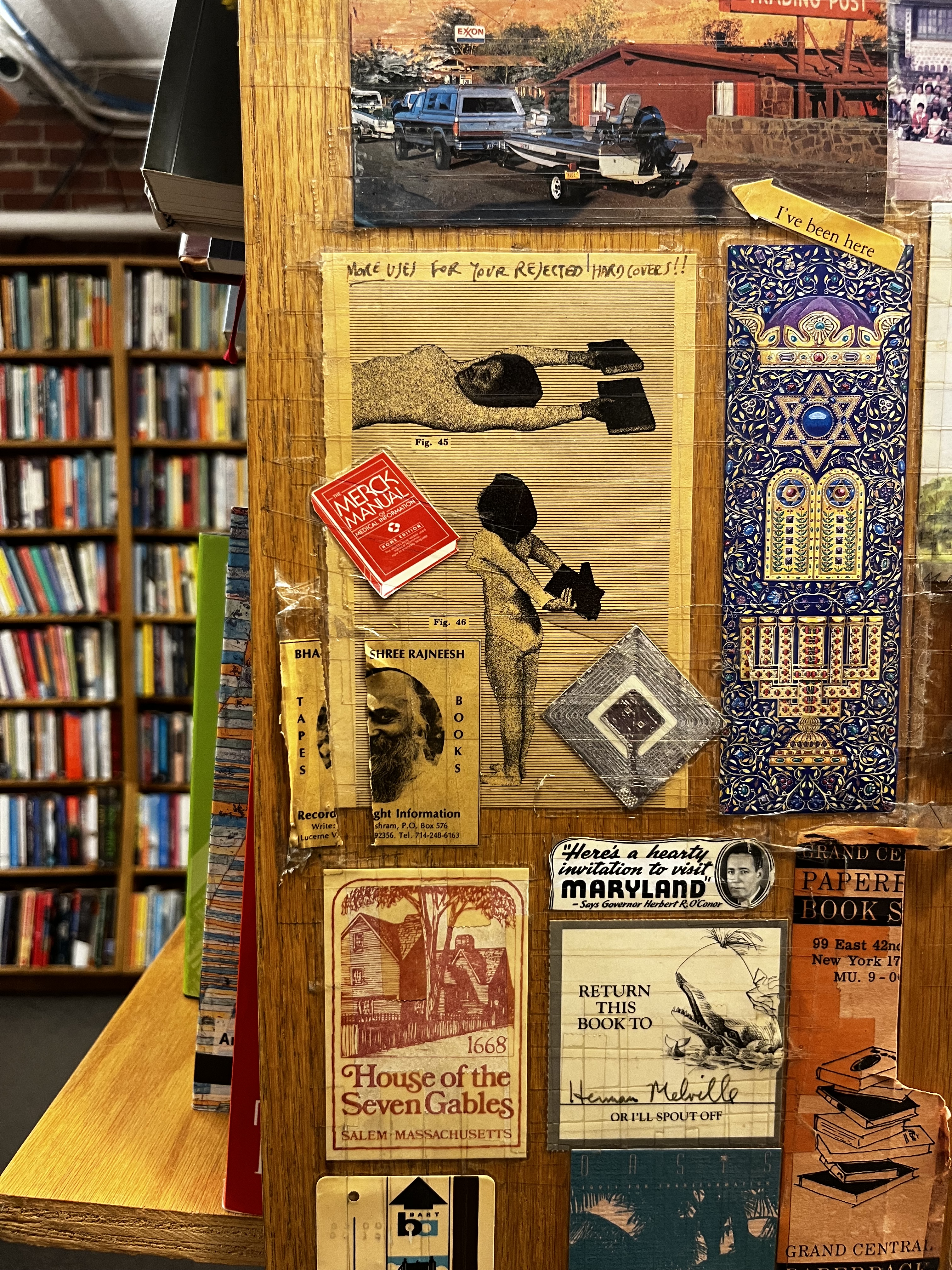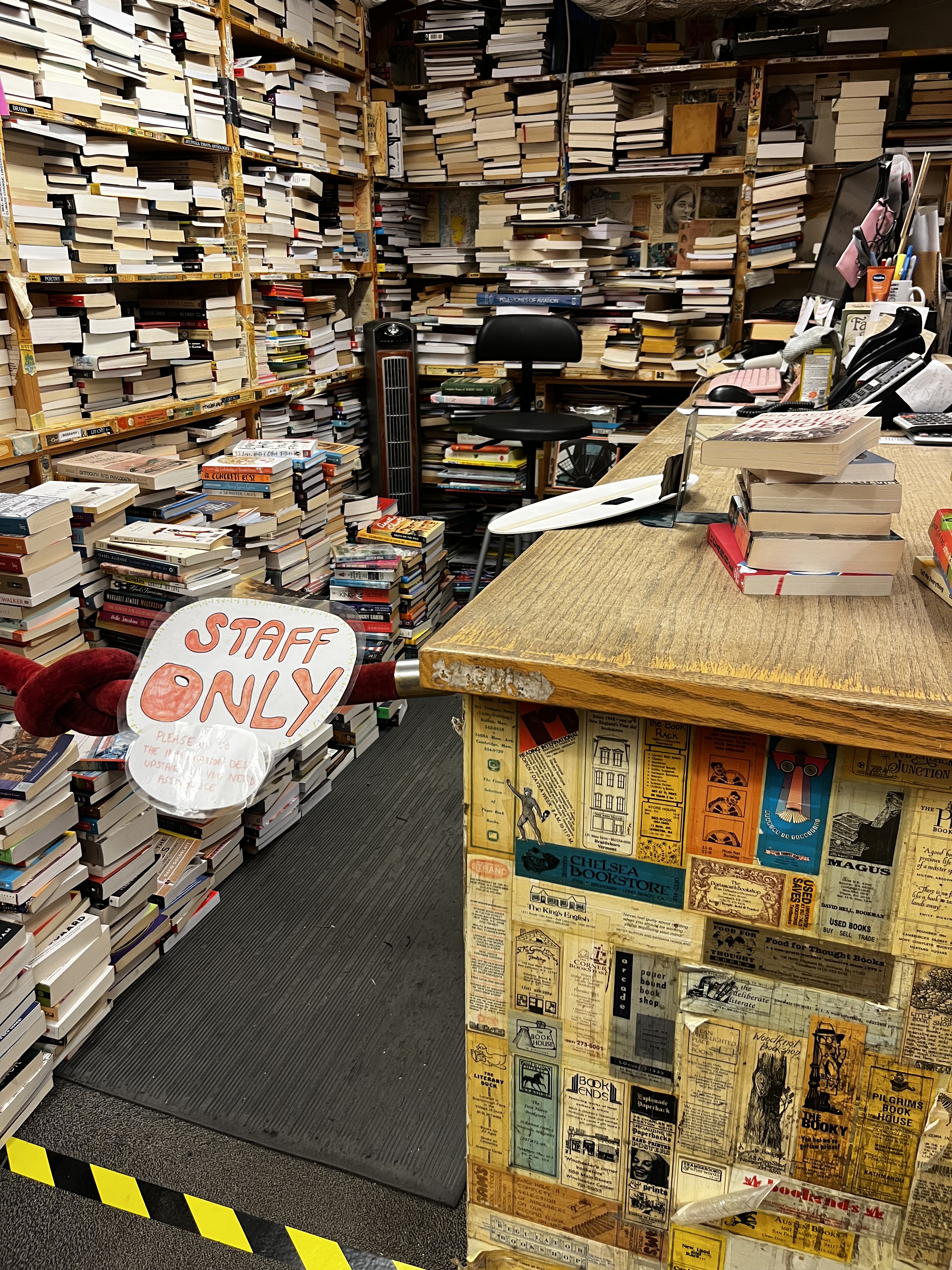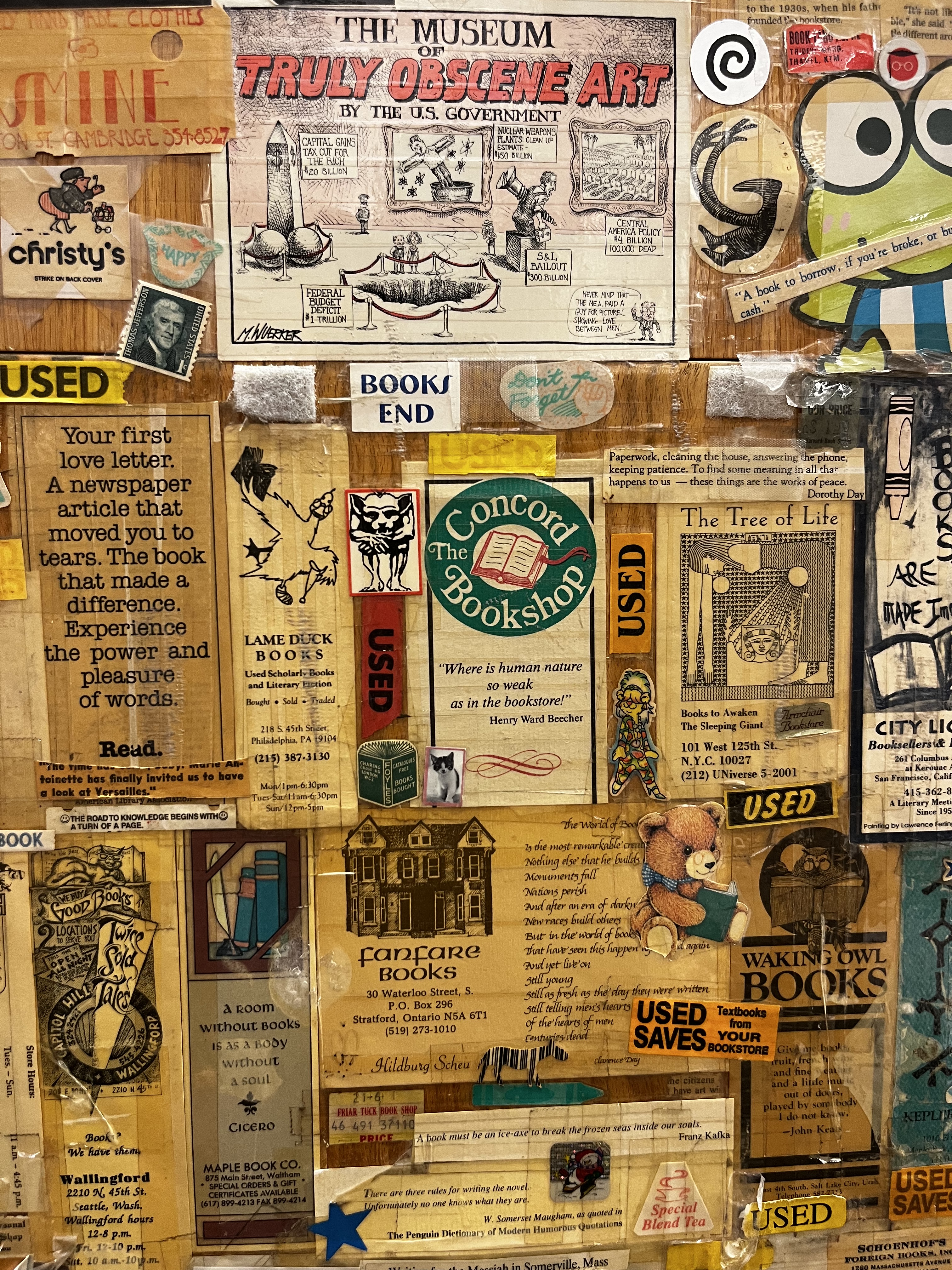 I was in that place where the ends of the bookshelves are covered in decades of notes, postcards, newspaper articles, paperback book covers, pamphlets, Post-its, and photocopied art. It was complete clutter, overstimulation, and dust allergens. It was amazing! If you don’t think so, skip ahead to the section about the Romance-themed bookstore with a coffee bar, wine flights, and charcuterie boards.