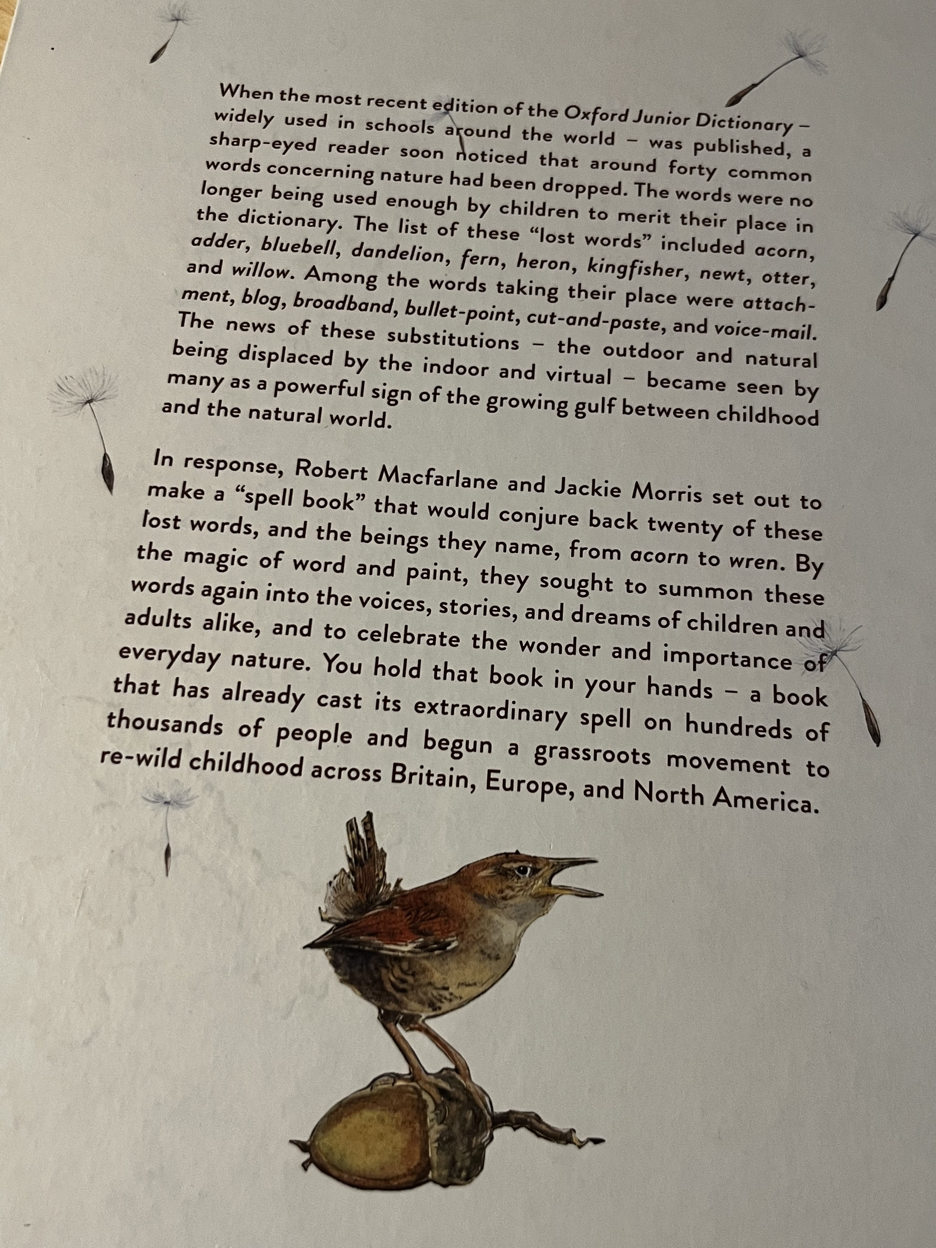 “In 2007, when a new edition of the Oxford Junior Dictionary — widely used in schools around the world — was published, a sharp-eyed reader soon noticed that around forty common words concerning nature had been dropped. Apparently they were no longer being used enough by children to merit their place in the dictionary. The list of these “lost words” included acornadderbluebelldandelionfernheronkingfishernewtotter, and willow. Among the words taking their place were attachmentblogbroadbandbullet-point, cut-and-paste, and voice-mail. The news of these substitutions — the outdoor and natural being displaced by the indoor and virtual — became seen by many as a powerful sign of the growing gulf between childhood and the natural world.