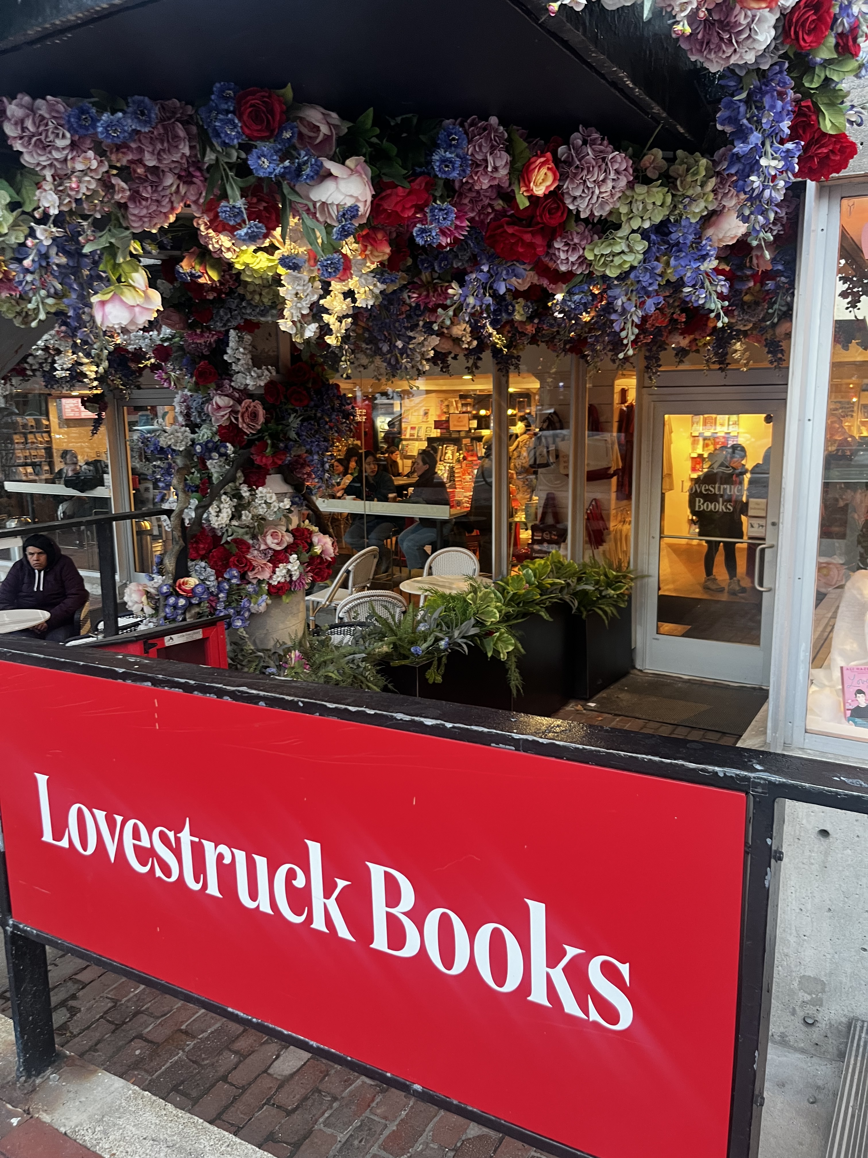 The exterior of the bookstore, blanketed in a canopy of colorful artificial flowers and with café tables out front, caught my eye the first time I walked past. I was headed to my workshop, so there was no time to stop, but I was determined to get there.